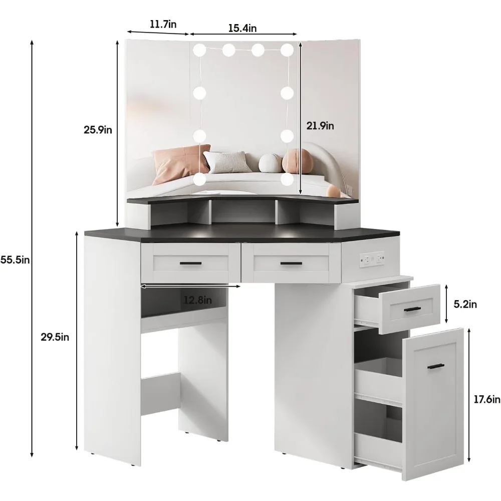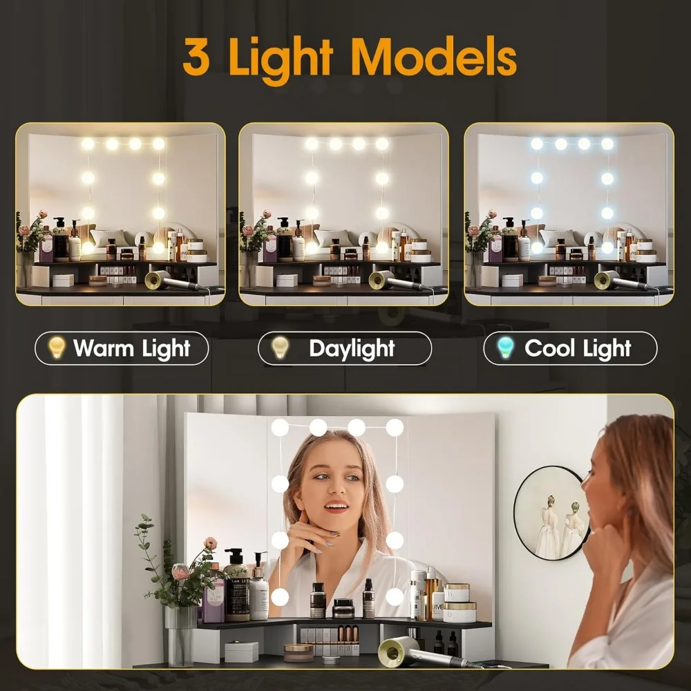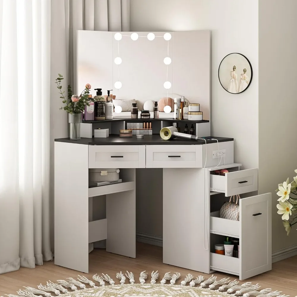 - Functional Vanity Desk: Corner vanity desk with mirror and lights, 10 led lighted bulbs, 3 storage drawers and 3 open storage shelves, 2 tier sliding cabinet. Built-in power strip with 2 outlets and 2 usb ports, which is designed to meet your daily need
