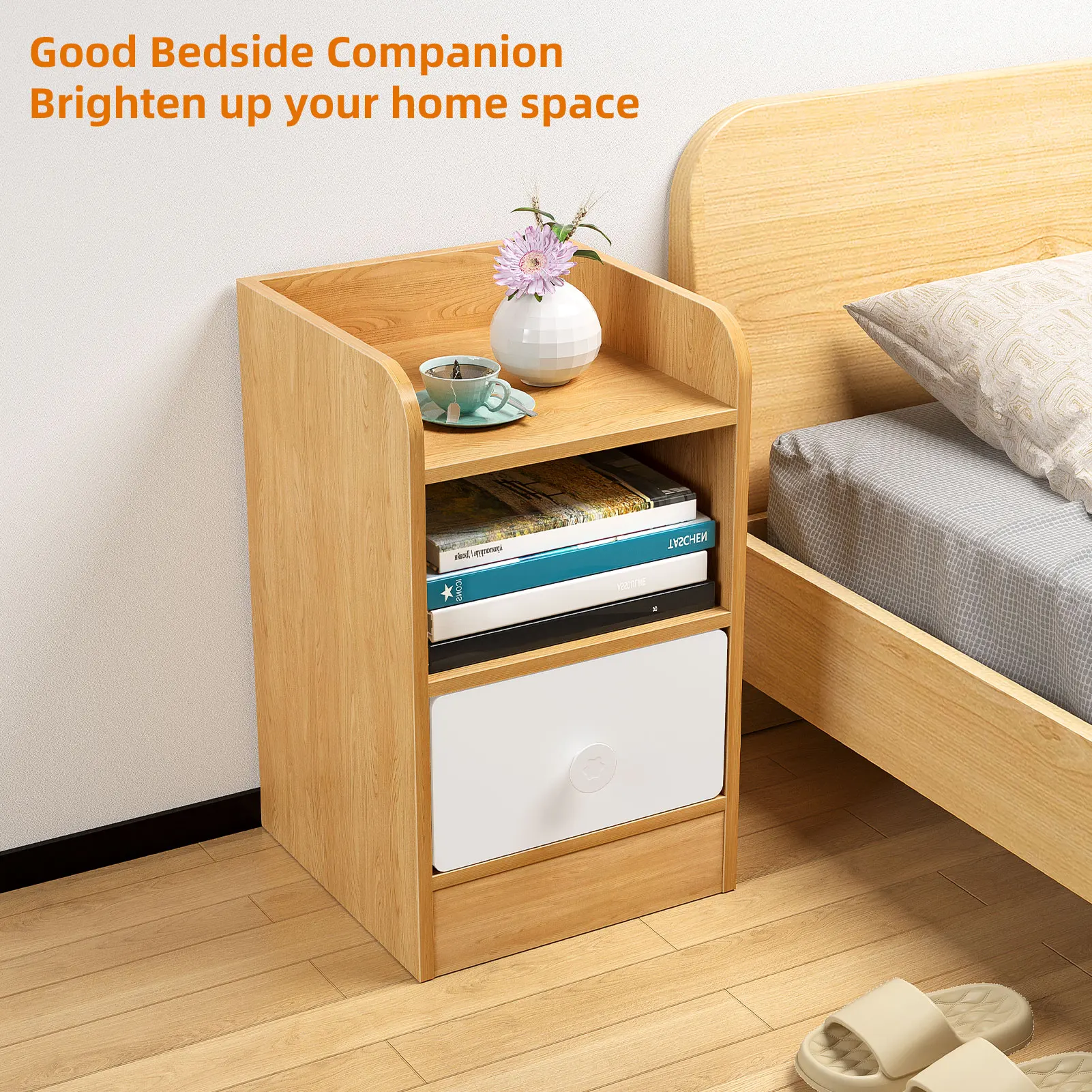 Ample Storage Space: Since the bedside table is designed with a drawer, an open storage shelf and spacious desktop, the nightstand allows you to position a little warm lamp, some magazines, small radio on this bedside table, or a variety of other items on them.